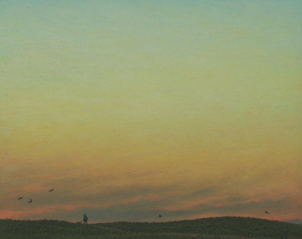 'The High Ground' shows a little of Outram's countryside silhouetted against a lot of sky, the fading shades of a dramatic sunset. There is only the 'gloaming' light left to illuminate the small figure of a man, a dog and some scattered birds on the horizon. We get a sense of Steven Outram's respect for the beauty and power of nature in this contemporary oil painting.