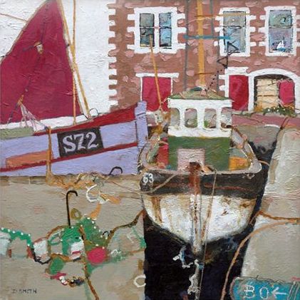 a scene in 'Eyemouth Harbour'. Eyemouth is a busy fishing port in Berwickshire. David Smith has chosen to portray the essence of the town, it's boats. Fishing boats jostle alongside each other in the narrow confines of the harbour.
