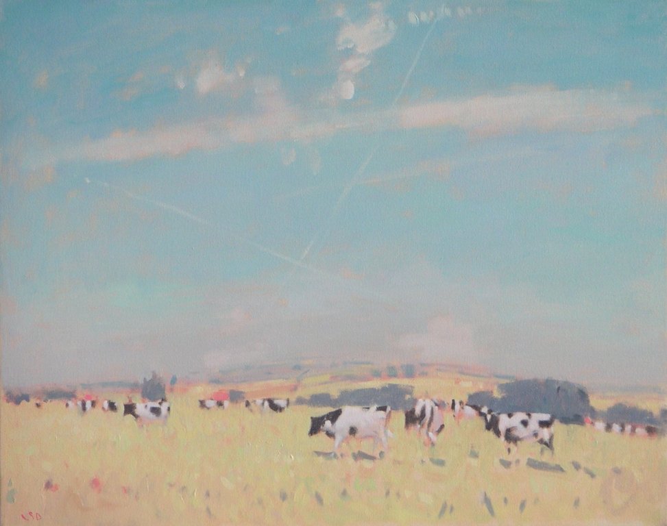 The grazing cows are set against his trademark big sky. There is a calmness and tranquil feeling to the painting and all is well with the world