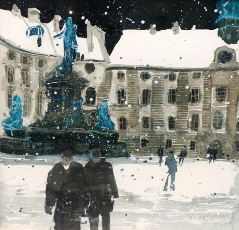 In 'Amalienberg, Vienna' Susan Brown captures the beauty of the old Hofburg palace and portrays it with a lightness of touch characteristic of her contemporary style. The building almost has a life of its own in this atmospheric scene. Lines are not rigid but have a fluid quality which lends them life and light. The building is made all the more dramatic by it's representation under a starry night sky with drifting snowflakes.